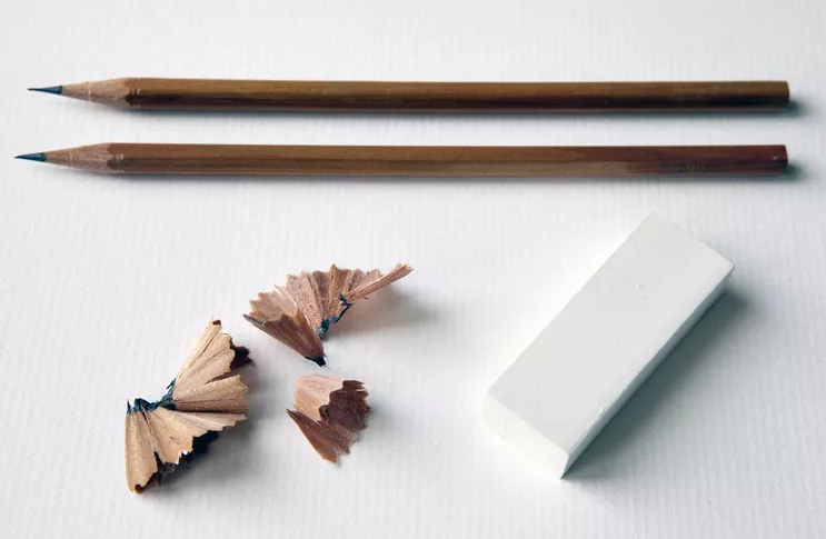 When laying out cut paper shapes onto a card people will often use a pencil to make light marks as a placement guide. After adhering your embellishments, the pencil marks need to be erased. Make sure only to use a white polymer eraser. Pink erasers and worse yet pencil erasers will leave dark spots and smudges on your card.